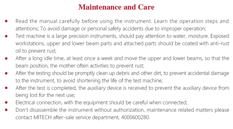 l Test machine is a large precision instruments, should pay attention to water, moisture. Exposed workstations, upper and lower beam parts and attached parts should be coated with anti-rust oil to prevent rust;